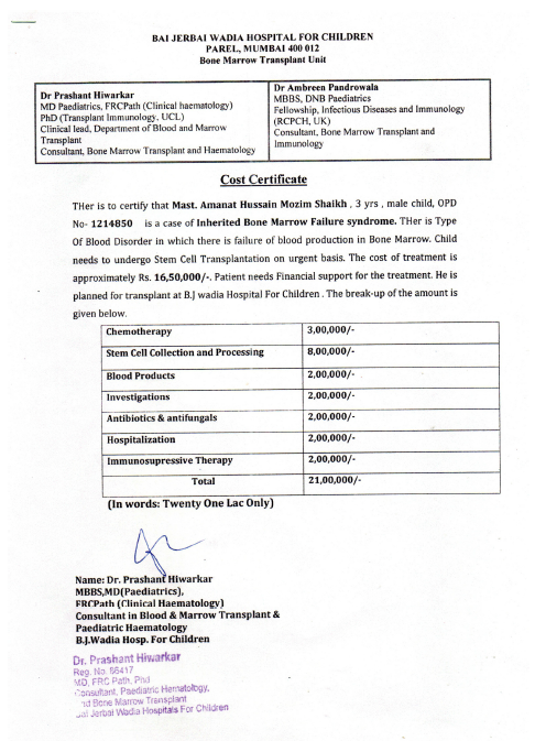 Marrow), Child needs to undergo Stem Cell Transplantation and the