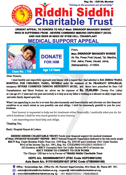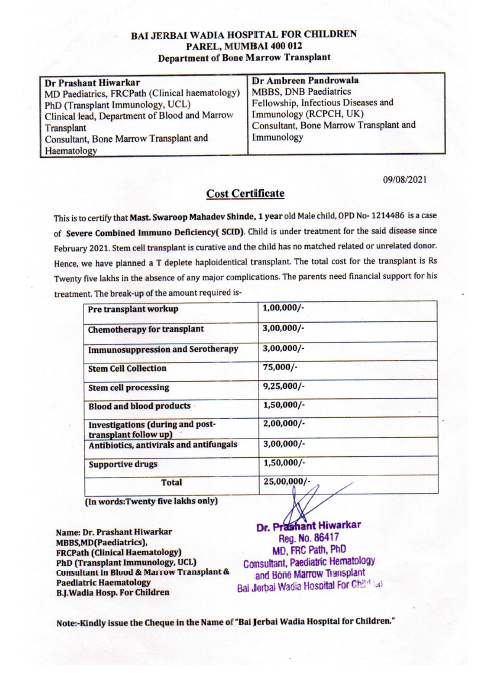 MUMBAI under the treatment of Dr. PRASHANT HIWARKAR, emergency SEVERE COMBINED IMMUNO DEFICIENCY (SCID),